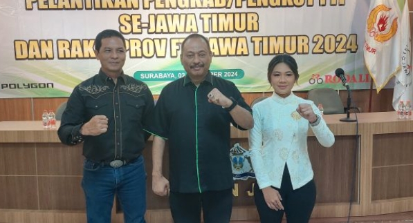 Ketua KONI Jatim M Nabil (tengah) bersama Ketua PP FTI Arman Van Kempen (kiri) dan Ketua FTI Jatim, Anastasia Kirana