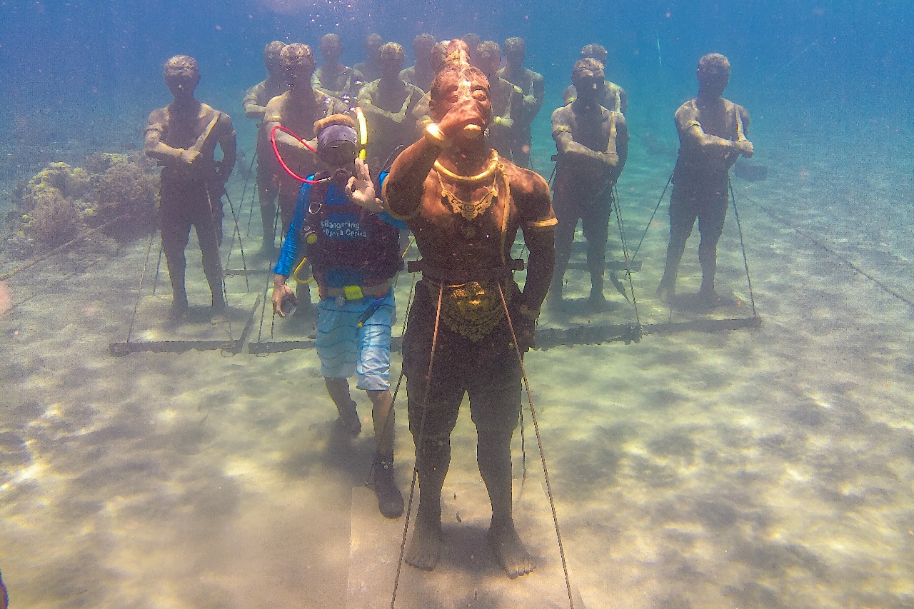 Majapahit’s Warior Underwater berupa patung Gajahmada dan belasan prajurit Majapahit beserta gapuranya yang dipasang di bawah laut dengan kedalaman sekitar 2,5 meter