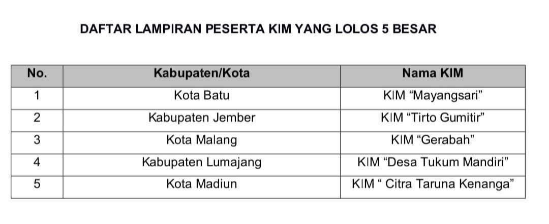 “Alhamdulillah, salah satu dari tiga KIM Desa yang kami ajukan ke tingkat Jawa Timur berhasil lolos ke 5 besar. Ini adalah pencapaian yang sangat membanggakan bagi kami,” ujarnya saat dikonfirmasi di kantornya, Senin (22/7/2024).