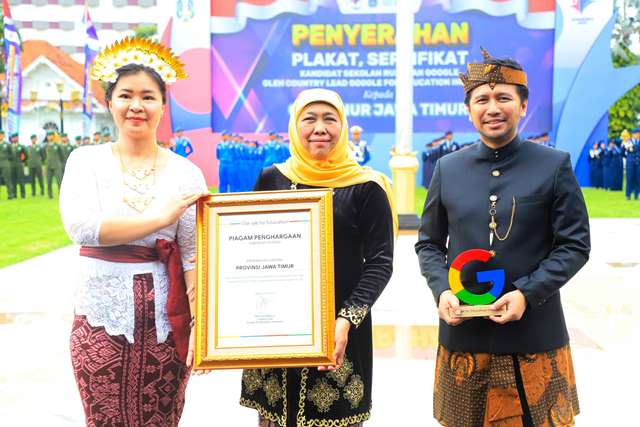 Penghargaan berupa plakat dan piagam diserahkan langsung oleh Olivia Husli Basrin selaku Country Lead Google For Education Indonesia kepada Gubernur Jawa Timur Khofifah Indar Parawansa saat Upacara Peringatan Hardiknas Tahun 2025 di Halaman Gedung Negara Grahadi Surabaya, Jumat (2/5/2025).