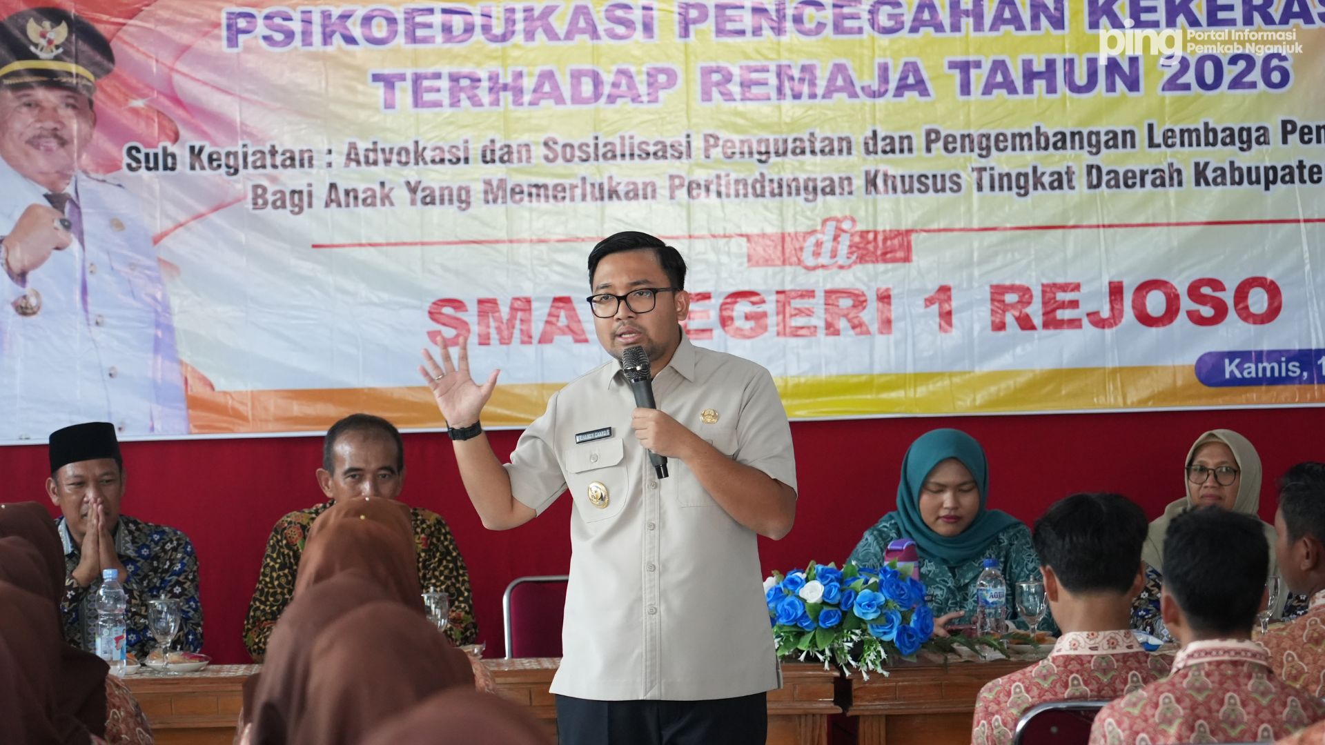 NGANJUK (wartadigital.id) – Wakil Bupati Nganjuk, Trihandy Cahyo Saputro, hadir langsung memberikan materi dalam kegiatan workshop psikoedukasi pencegahan kekerasan terhadap remaja yang diselenggarakan oleh Dinas Sosial P3A Kabupaten Nganjuk di SMA Negeri 1 Rejoso, Kamis (16/4/2026).