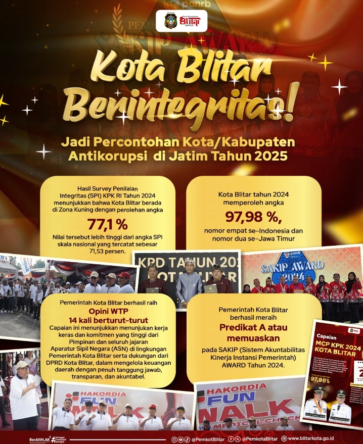 Selain itu, hasil Survei Penilaian Integritas (SPI) KPK RI Tahun 2024 menunjukkan bahwa Kota Blitar berada di Zona Kuning dengan perolehan angka 77,1 persen. Nilai tersebut lebih tinggi dari angka SPI skala nasional yang tercatat sebesar 71,53 persen.