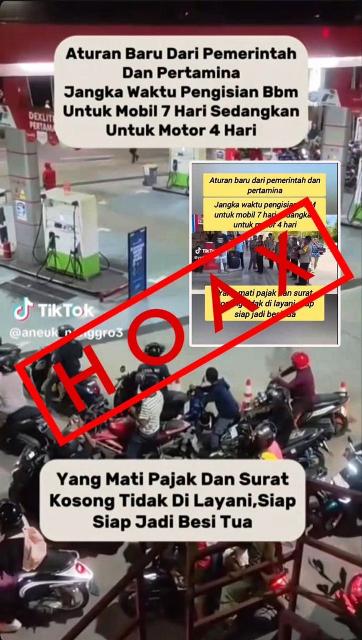 Maka Pertamina Patra Niaga merasa perlu untuk meluruskan sejumlah informasi hoaks yang beredar . Melalui Pj Corporate Secretary Pertamina Patra Niaga, Roberth MV Dumatubun menjelaskan pembatasan pengisian BBM hingga 7 hari untuk mobil dan 4 hari untuk motor, serta larangan bagi penunggak pajak kendaraan untuk mengisi BBM sebagaimana narasi yang muncul di medsos adalah tidak benar.