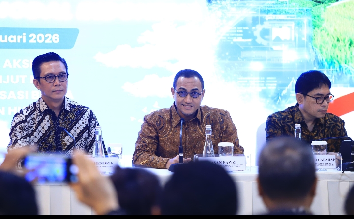 Komitmen iti disampaikan Pejabat Sementara Kepala Eksekutif Pengawas Pasar Modal, Keuangan Derivatif, dan Bursa Karbon OJK, Hasan Fawzi, dalam konferensi pers di Gedung Bursa Efek Indonesia, Senin (9/2/2026), bersama jajaran pimpinan OJK dan Direksi Self-Regulatory Organization (SRO).