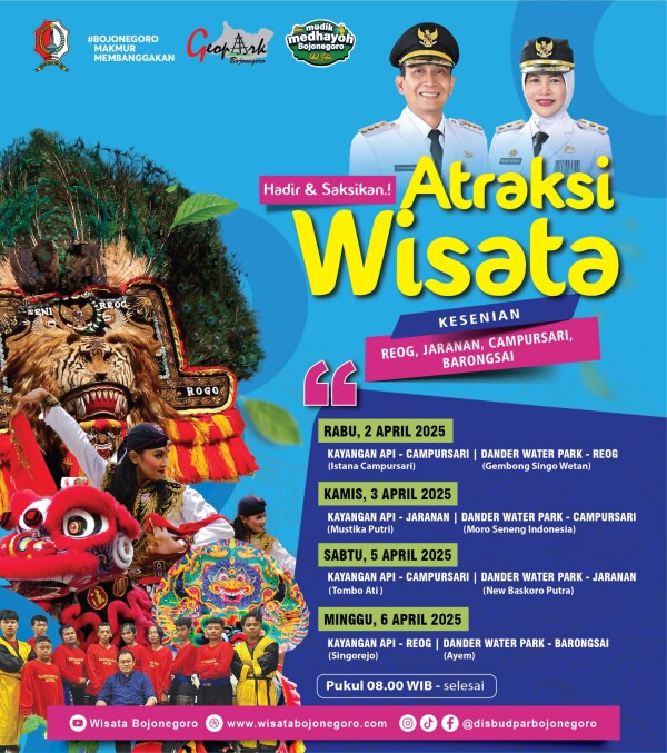 “Mari medayoh di Bojonegoro dengan berkunjung dan ramaikan destinasi wisata Bojonegoro, jangan lupa tetap menjaga sapta pesona ditempat wisata dengan memperhatikan kebersihan, keamanan, ketertiban, kerukunan dan persaudaraan,” kata dia. boe