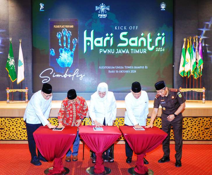 SURABAYA (wartadigital.id) – Penjabat (Pj) Sekretaris Daerah Jawa Timur Bobby Soemiarsono bersama Rais Syuriah PWNU Jatim KH Anwar Manshur, Ketua Tandfiziyah PWNU Jatim KH Abdul Hakim Mahfudz dan Rektor Unusa Prof Achmad Jazidie melakukan penekanan tombol sebagai tanda Kick Off Hari Santri PWNU Jawa Timur Tahun 2024 di Auditorium Unusa Tower Surabaya, Rabu (16/10/2024).