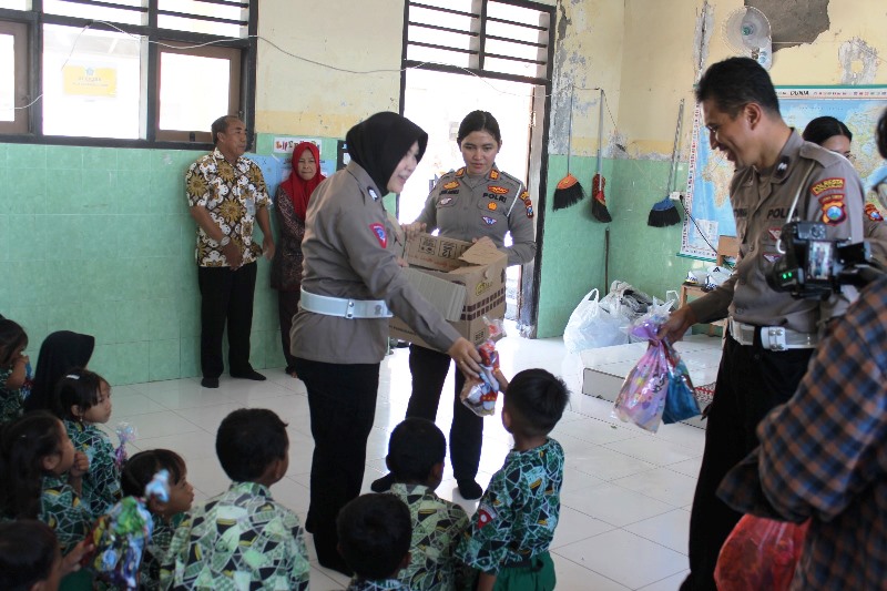 Anggota Unit Kamsel Satlantas Polresta Sidoarjo dipimpin AKP Latifa Andika menemui siswa-siswi SDN 2 Sawohan dan SMPN Satu Atap Kepetingan untuk memberikan edukasi terkait tertib berlalu lintas.