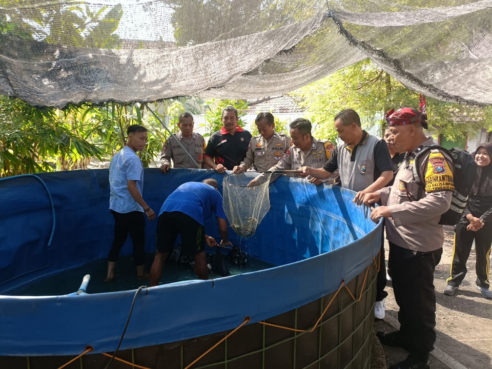 Setelah itu, dilanjutkan dengan panan hasil budidaya ikan lele yang ada di halaman Mako Polsek Tanggulangin. Ada 50 bungkus berisi 2 kg ikan lele dibagikan kepada warga yang membutuhkan.