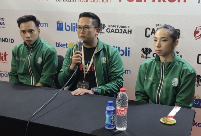 Ketua Pengprov Wushu Jatim, M Ali Affandi Mattalitti bersama Jennifer Tjahyadi dan Daffa Golden Boy pada sesi jumpa pers di Media Center PON Bela Diri 2025 Kudus