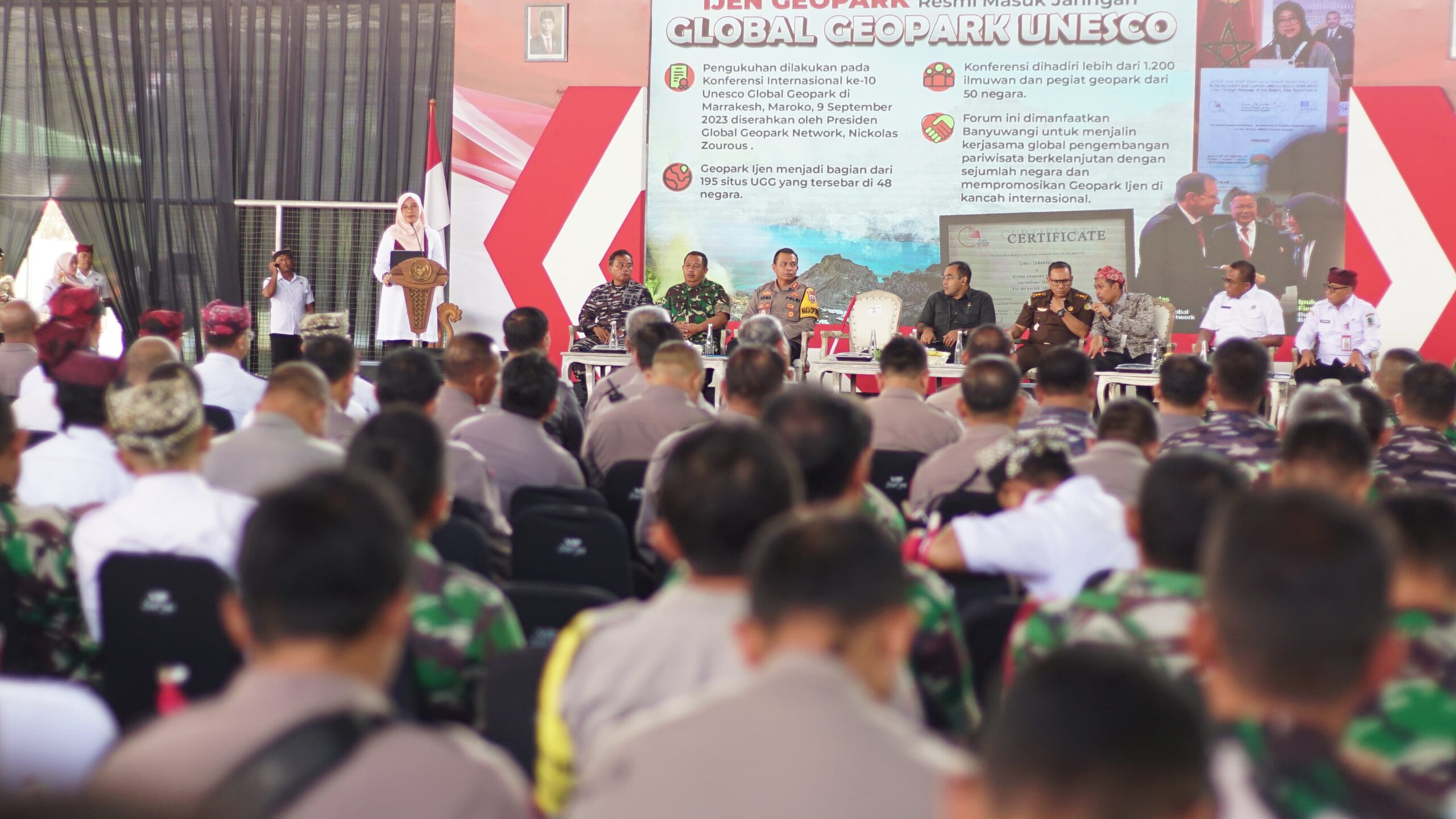 “Mengawali pertemuan ini, saya ingin menyampaikan terima kasih dan apresiasi kepada semua pihak, khususnya kepala desa, Babinsa dan Bahabinkamtibmas yang gotong royong menjaga dan membangun Banyuwangi,” kata Bupati Ipuk.