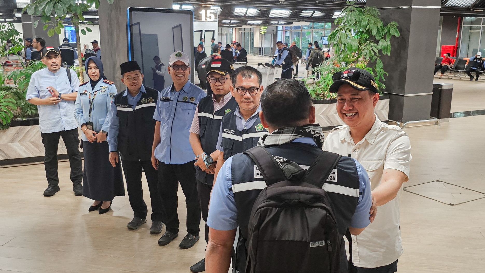 Dirjen PHU Hilman Latief beserta jajaran menyambut kedatangan PPIH Arab Saudi Daker Madinah dan Bandara di Terminal 2F Bandara Soekarno-Hatta