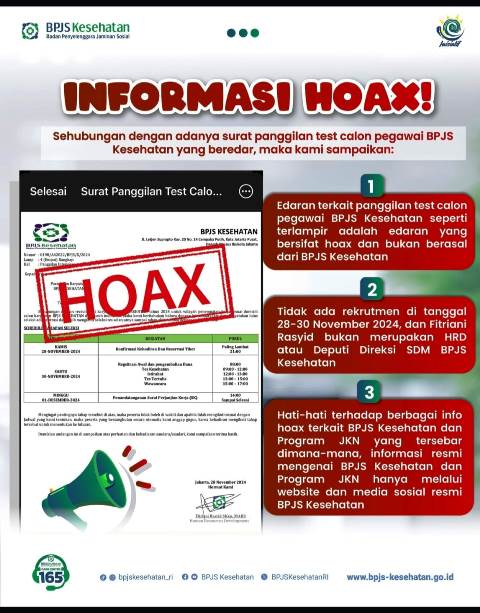 “Dapat kami sampaikan bahwa informasi tersebut adalah informasi palsu atau hoaks serta terindikasi penipuan. Sehingga untuk masyarakat yang menerima surat tersebut agar diabaikan dan tidak mudah percaya dengan surat pemanggilan tersebut karena saat ini kami tidak sedang membuka lowongan pekerjaan. Di dalam surat tersebut juga yang menandatangani bukan dari pegawai BPJS Kesehatan,” kata Munaqib, Jumat (29/11/2024).