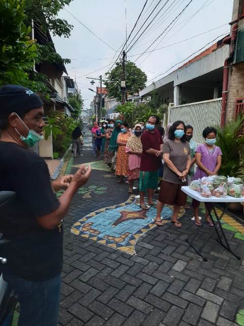 “Setiap Jumat kami menyediakan 45 paket yang masing-masing paket berisi sayuran, tahu, tempe, bumbu, dan mie goreng. Kami sengaja memilih paket sembako bukan nasi karena biar bisa dinikmati semua anggota keluarga,” jelasnya.