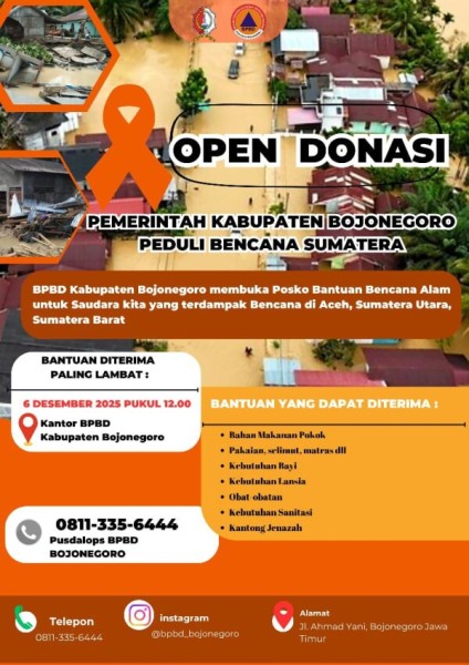 BOJONEGORO (wartadigital.id) – Pemerintah Kabupaten Bojonegoro melalui Badan Penanggulangan Bencana Daerah (BPBD) membuka posko donasi peduli bencana untuk membantu korban terdampak bencana alam yang terjadi di Aceh, Sumatera Utara dan Sumatera Barat.