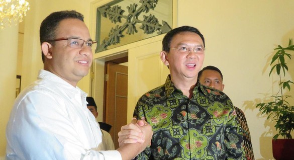 Pramono dan Rano Karno terlihat menyerahkan sejumlah dokumen syarat pendaftaran cagub-cawagub di Pilkada DKI Jakarta sekitar pukul 11.16 WIB di dalam kantor KPU, Jakarta Pusat.