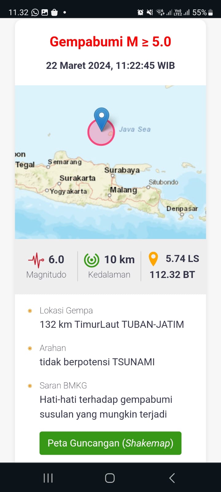 SURABAYA (wartadigital.id) – Gempa berkekuatan magnitudo 6,1 mengguncang Kabupaten Tuban, Jawa Timur, Jumat (22/3/2024) siang.