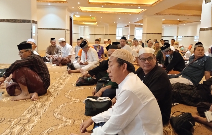 Para jemaah Bryan Makkah yang mengikuti bimbingan dan pengajian di lantai masjid hotel, Rabu (12/6/2024)