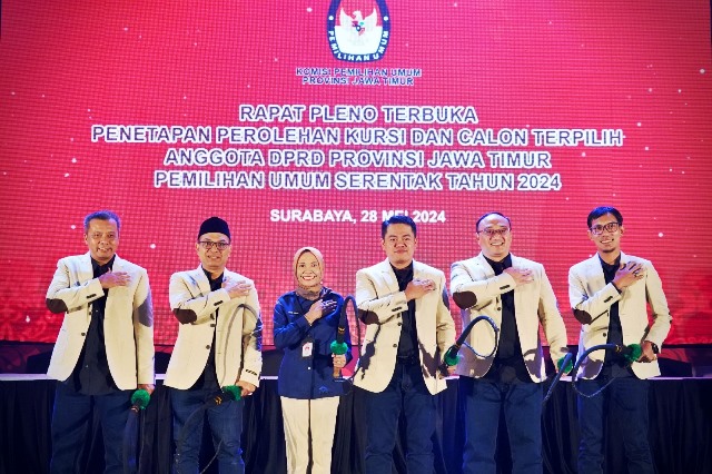 SURABAYA (wartadigital.id) – Komisi Pemilihan Umum (KPU) Provinsi Jatim menggelar Rapat Pleno Terbuka Penetapan Perolehan Kursi dan Calon Terpilih Anggota DPRD Provinsi Jawa Timur Pemilu Serentak Tahun 2024 di Hotel Shangri-La, Selasa (28/5/2024) pagi.