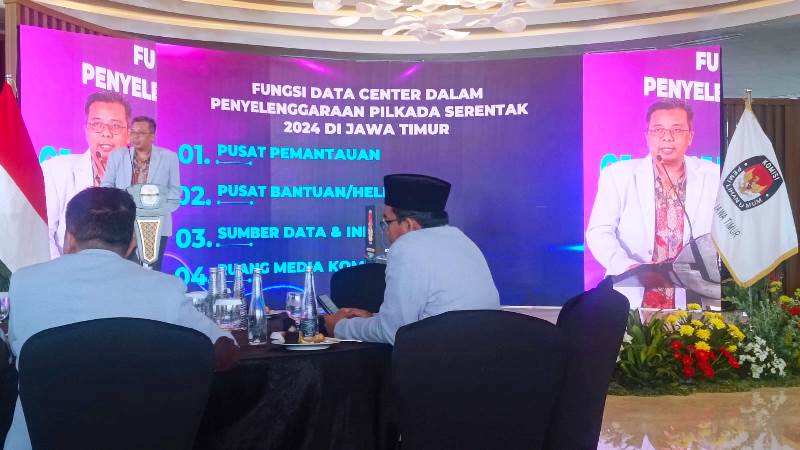Komisioner KPU Jatim Divisi Data dan Informasi Insan Qoriawan mengungkapkan Data Center ini memuat berbagai informasi Pilkada Serentak 2024. Mulai distribusi surat suara, jumlah pemilih, jumlah TPS lengkap dengan titik koordinat lokasinya, serta proses pemungutan suara, penghitungan suara hingga berbagai hal terkait pelaksanaan pemilihan kepala daerah di 38 kabupaten/kota se-Jatim, termasuk berbagai permasalahan yang muncul. “Keberadaannya di sini, (lantai 23 Hotel Double Three, Red). Semua terkait pelaksanaan pemilu semua bisa diakses di sini, misalnya di TPS X di Desa Z Kecamatan Y itu koordinatnya dimana bisa dipantau di sini,” ujarnya.