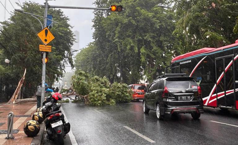 Pohon tumbang setelah hujan deras mengguyur Surabaya, Minggu (8/12/2024).