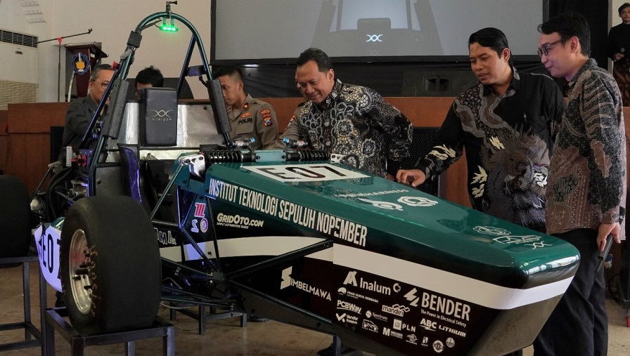 (Dari kanan) Pembina Tim Anargya ITS Alief Wikarta ST MScEng PhD, Direktur Kemahasiswaaan ITS Dr Imam Abadi ST MT, dan Wakil Rektor Bidang Inovasi, Kerjasama dan Kealumnian ITS Agus Muhamad Hatta ST MSi PhD ketika meresmikan peluncuran mobil Anargya Formula EV Mark 4.0.