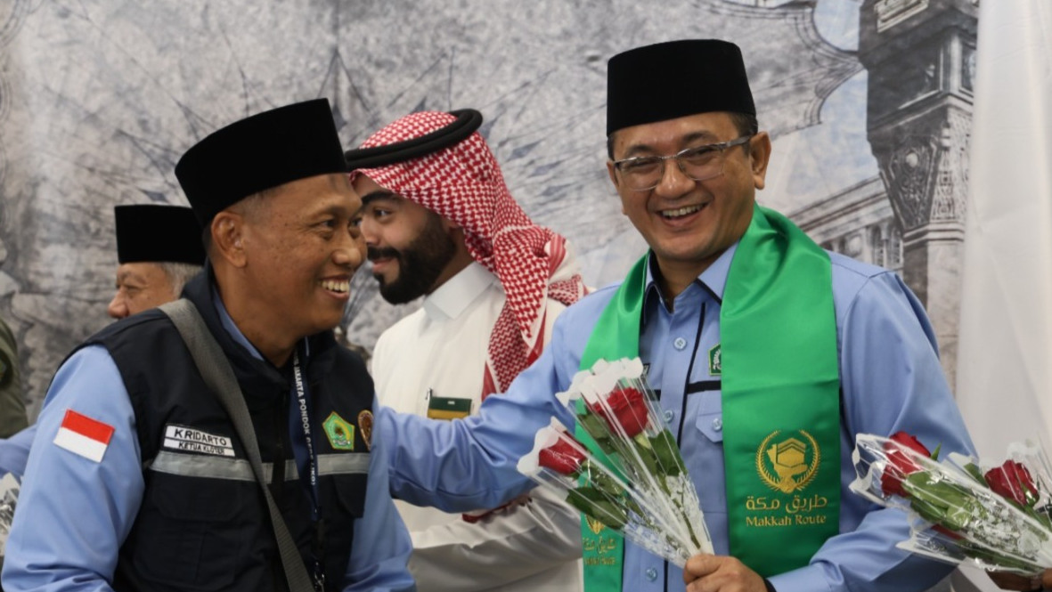 Konjen RI di Jeddah Yusron B Ambary (kanan) sambut kedatangan jemaah di Madinah